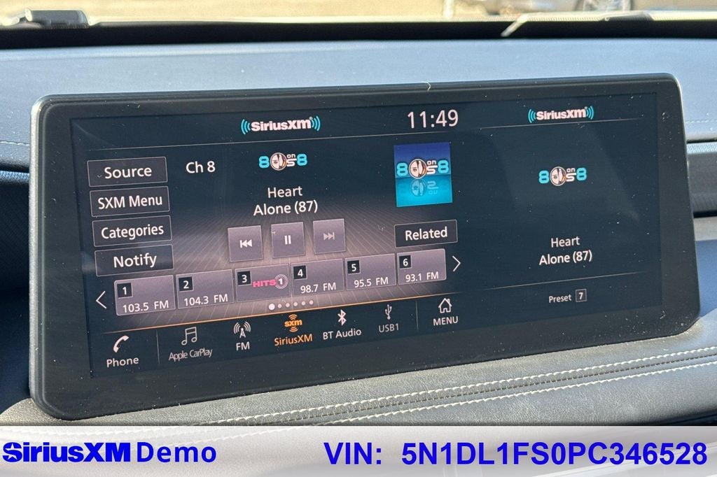 - Radio: AM/FM Audio System -inc: 9 speakers, INFINITI InTouch 12.3" interactive display w/navigation, wireless Apple CarPlay w/integration, Android Auto, Siri Eyes Free, Google Assistant, INFINITI voice recognition, Bluetooth® hands-free phone, HD Radio technology, WiFi hotspot and SiriusXM radio