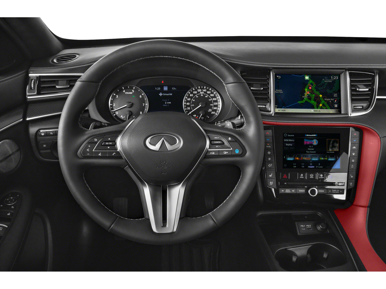 - Radio: Bose Premium Audio System -inc: 12 speakers, INFINITI InTouch, INFINITI InTouch services, INFINITI InTouch dual display system w/upper 8" and lower 7" HD touch screens, wireless Apple CarPlay, Android Auto, HD Radio technology, SiriusXM radio w/advanced audio features and 90-day complimentary trial, SiriusXM Travel Link w/90-day complimentary trial, INFINITI voice recognition, Siri Eyes Free, Wi-Fi hotspot, active noise cancellation, Bluetooth® hands-free phone system and streaming audio via Bluetooth®